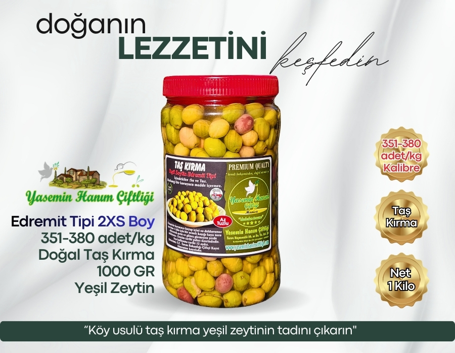 Kendi bahçelerimizden özenle hasat edilen Edremit tipi 2XS boy taş kırma yeşil zeytinler. Köy usulü taş kırma yöntemiyle işlenmiş, sade içerik ve doğal tat garantisi. Net 1 kg ambalaj, 351–380 adet/kg kalibre.