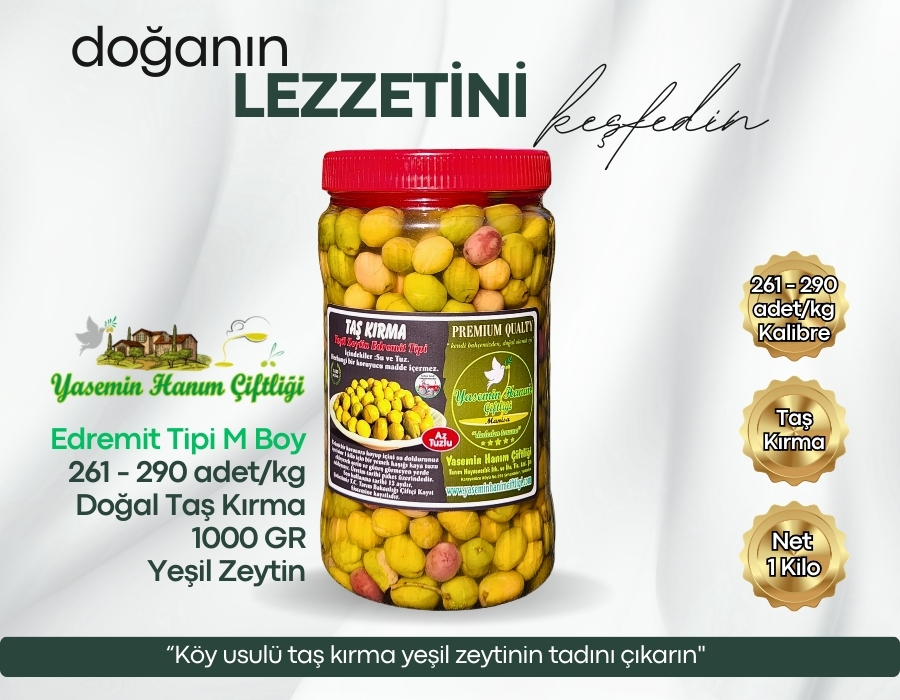 Kendi bahçelerimizden özenle hasat edilen Edremit tipi M boy taş kırma yeşil zeytinler. Köy usulü taş kırma yöntemiyle işlenmiş, sade içerik ve doğal tat garantisi. Net 1 kg ambalaj, 261–290 adet/kg kalibre.