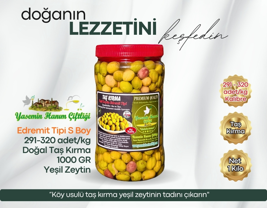 Kendi bahçelerimizden özenle hasat edilen Edremit tipi S boy taş kırma yeşil zeytinler. Köy usulü taş kırma yöntemiyle işlenmiş, sade içerik ve doğal tat garantisi. Net 1 kg ambalaj, 291–320 adet/kg kalibre.
